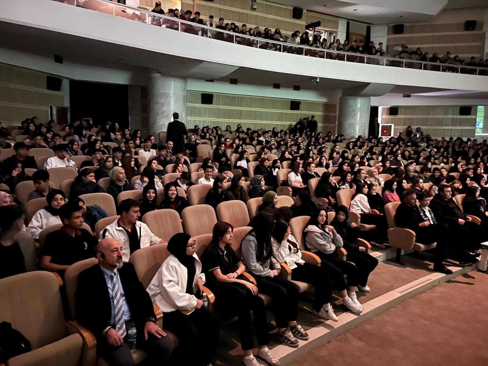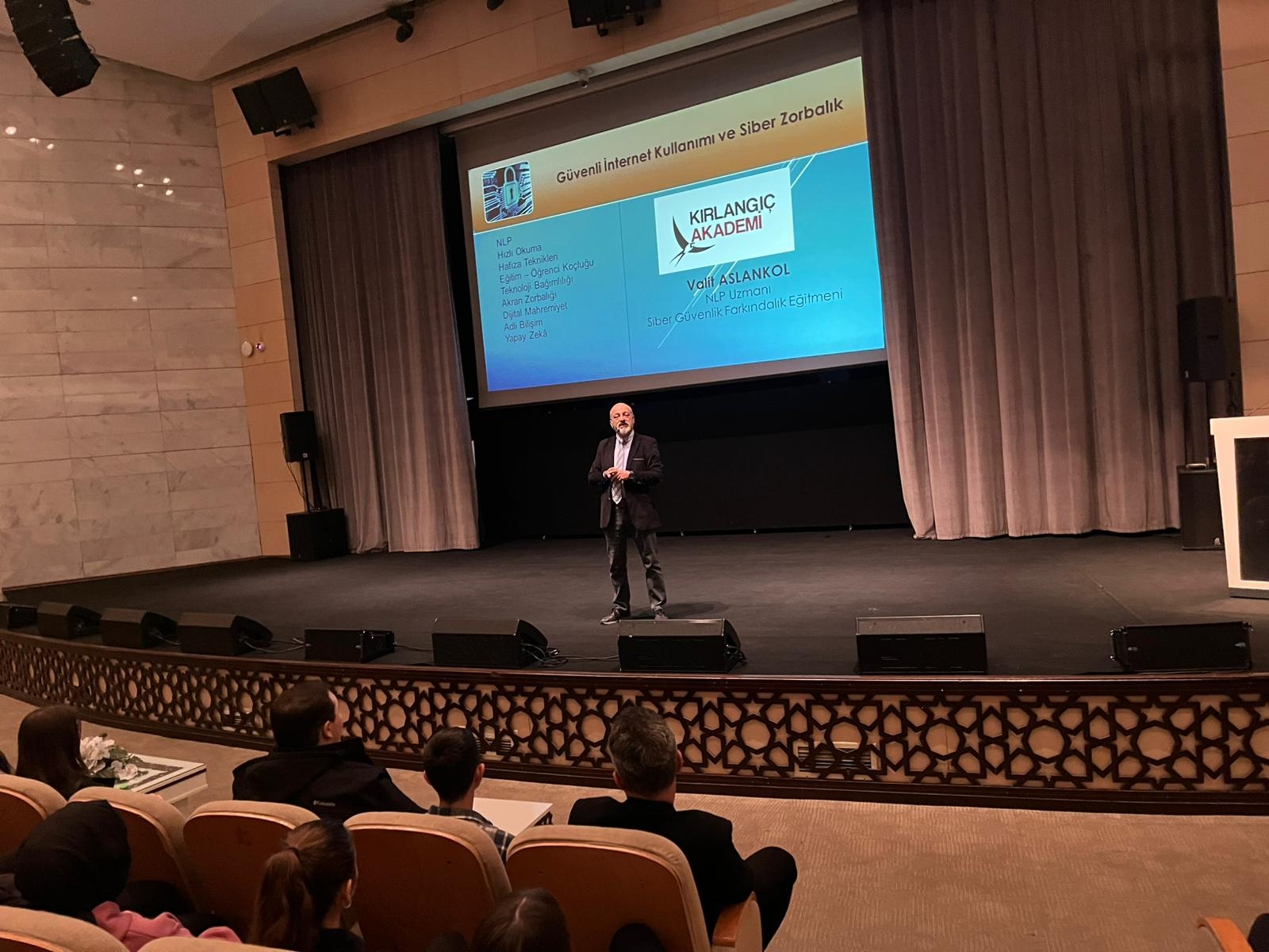 Öğrencilere dijital dünyada güvenli davranış alışkanlıkları kazandırmak ve bilinçli medya kullanımı konusunda farkındalık oluşturmak amacıyla düzenlenen seminerde, Siber Güvenlik Uzmanı Valit Aslankol öğrencilere önemli bilgiler aktardı.
